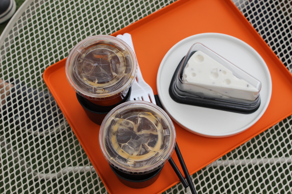 조금 기다리니 예쁜 주황색 트레이에 커피와 디저트가 담겨 나왔습니다.
