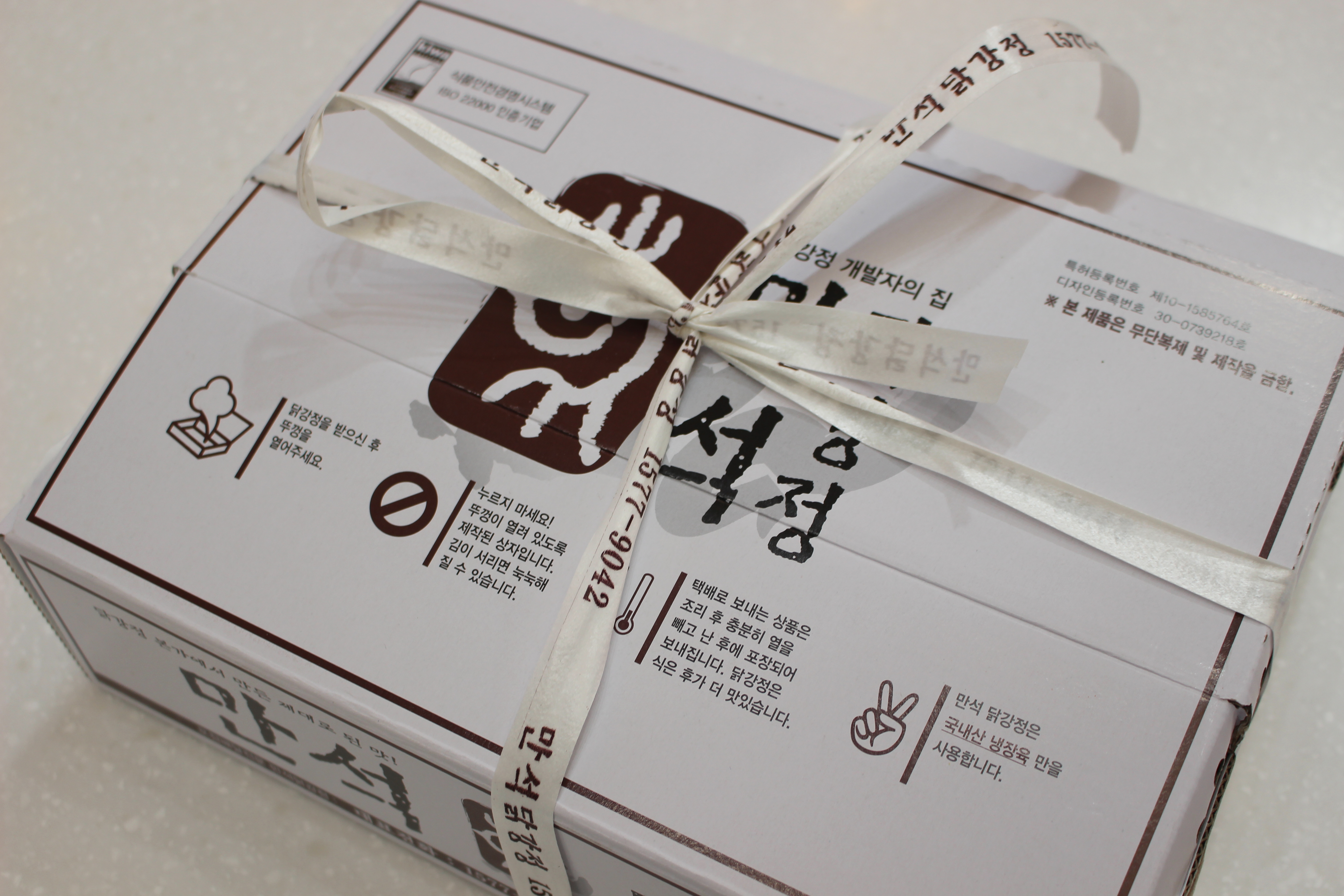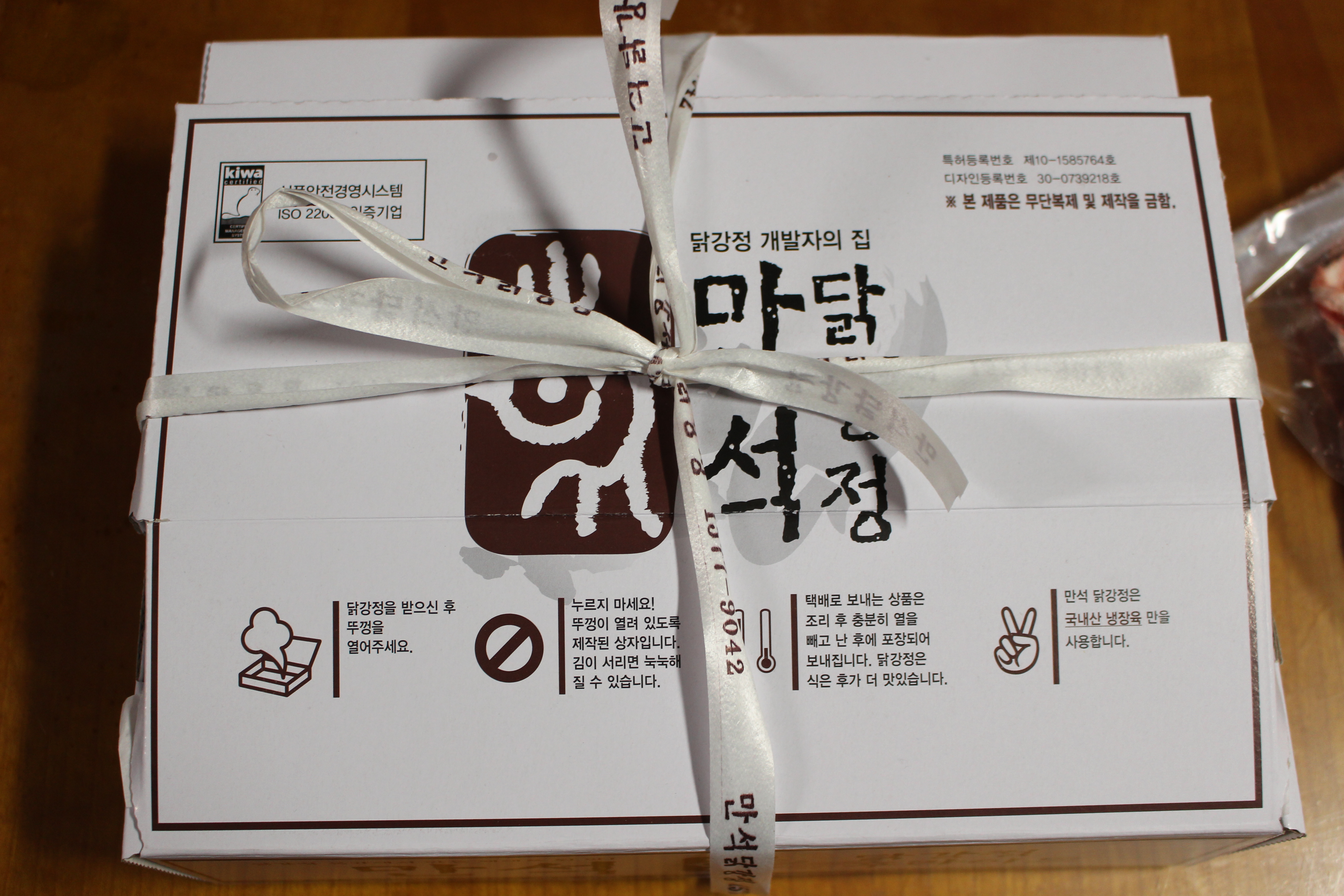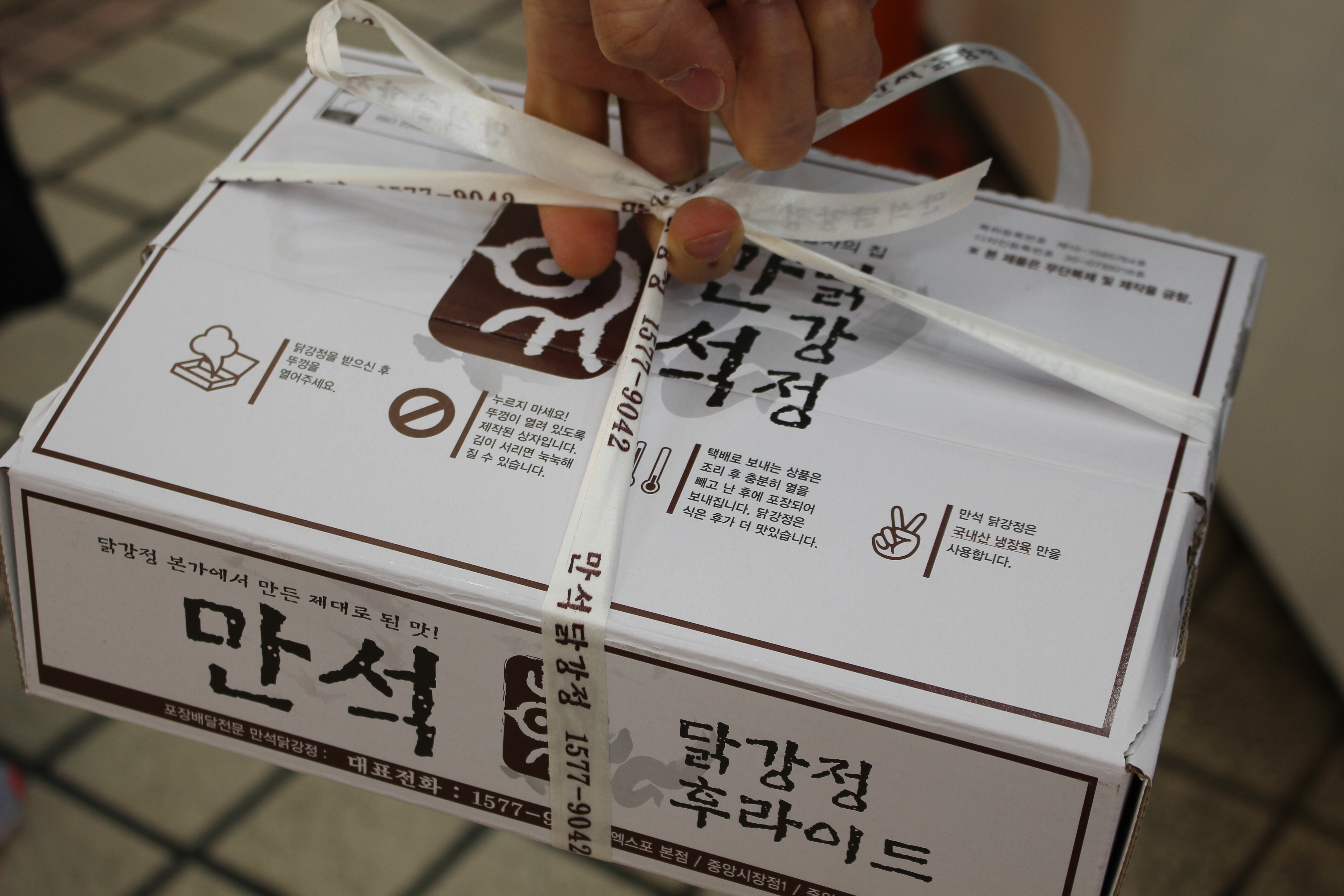 포장도 깔끔합니다. 닭강정을 받으면 뚜껑을 열어놔야 하고 뚜껑은 누르지 말라고 쓰여 있네요. 뚜껑이 열려 있도록 제작된 상자로 김이 서리면 눅눅해질 수 있다고 합니다.