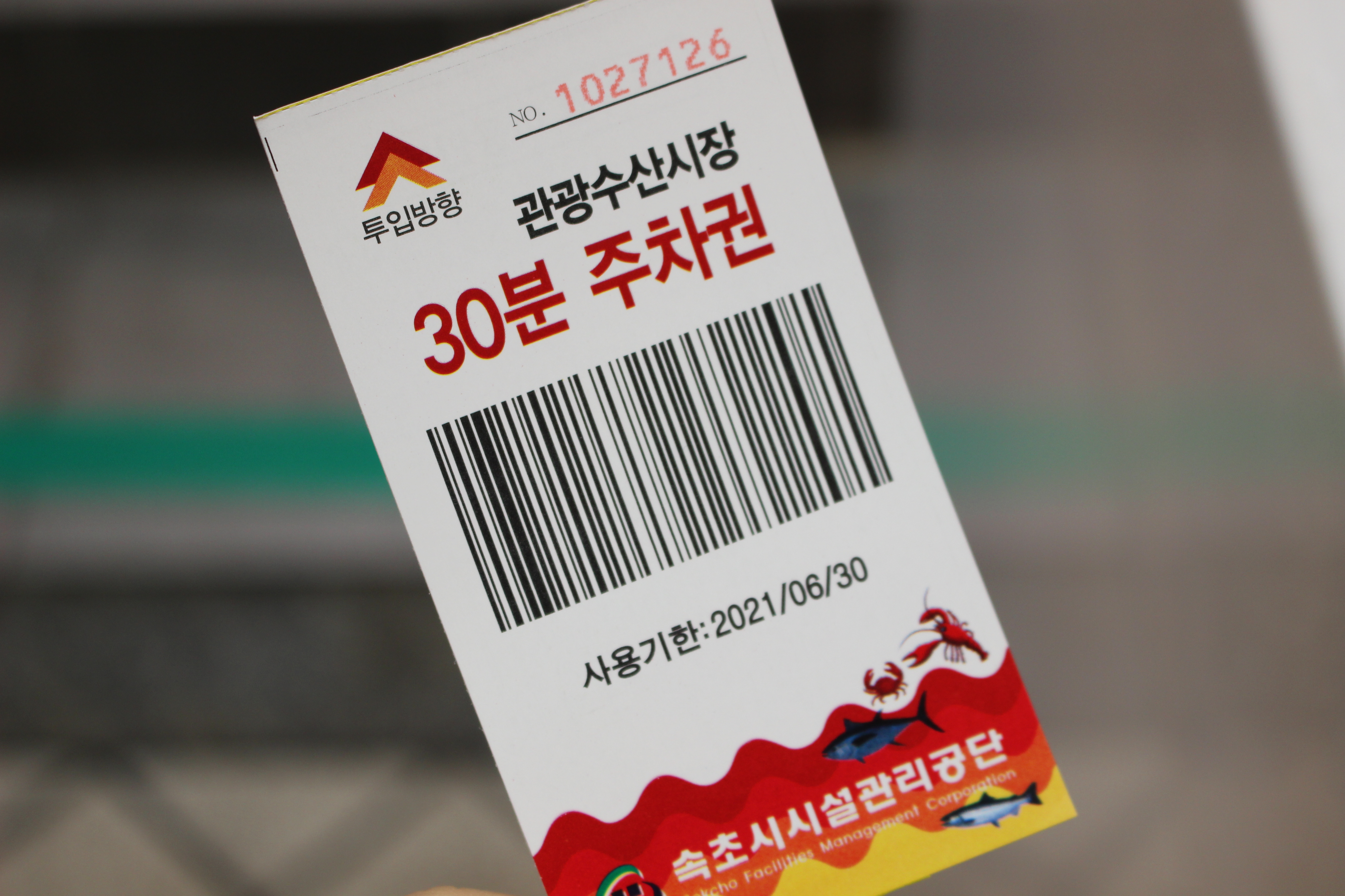 관광수산시장에서 구매를 하면 주차권을 받을 수 있습니다. 저는 30분 주차권을 받았습니다. 후다닥 음식만 사고 나왔기 때문에 30분으로도 충분했습니다.