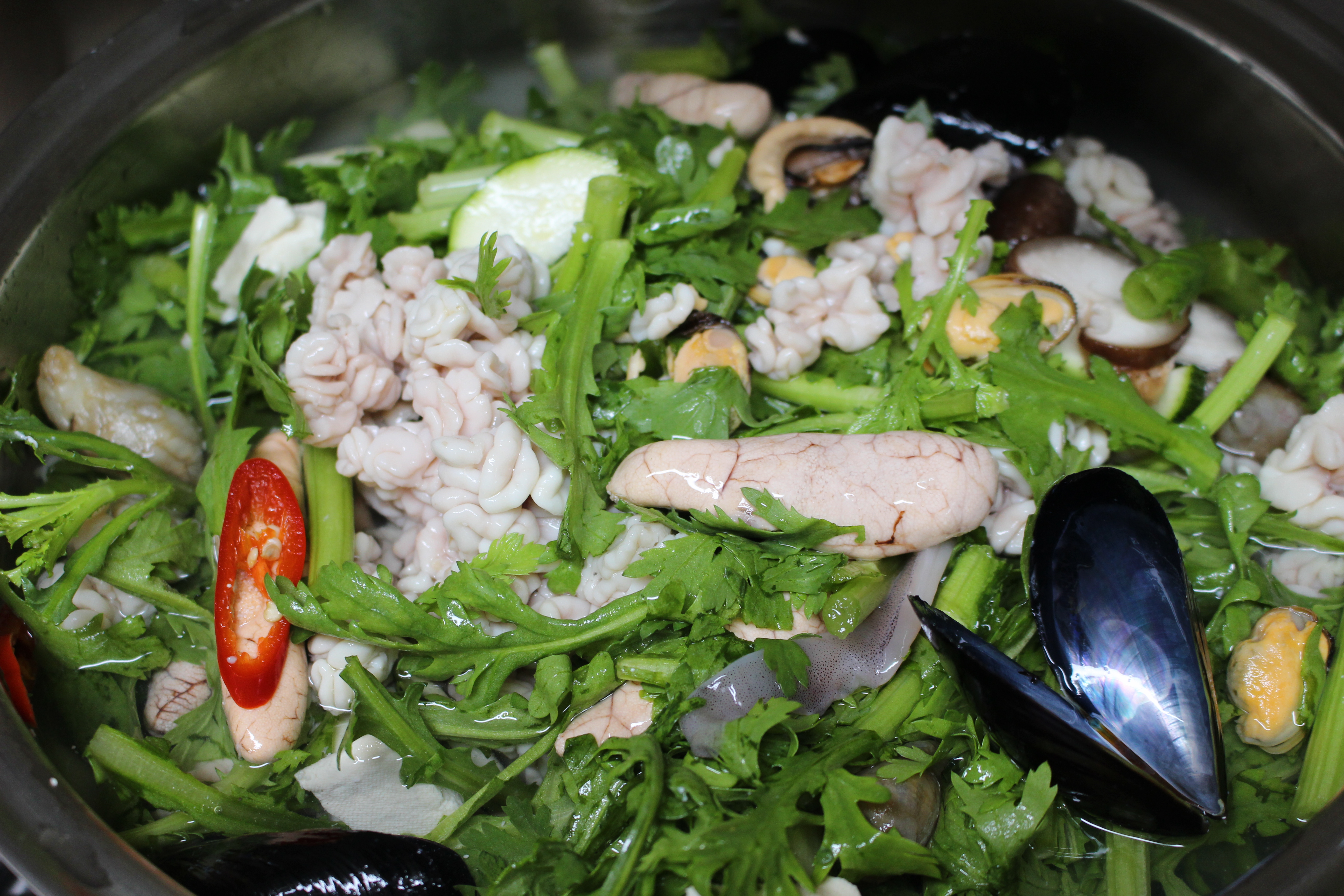 냄비에 포장용기를 뒤집어 음식을 넣으니 더 많은 쑥갓과 함께 홍합, 오징어, 두부, 오만둥이가 들어있는 걸 확인할 수 있었습니다. 해물탕스러운 비주얼이었습니다.