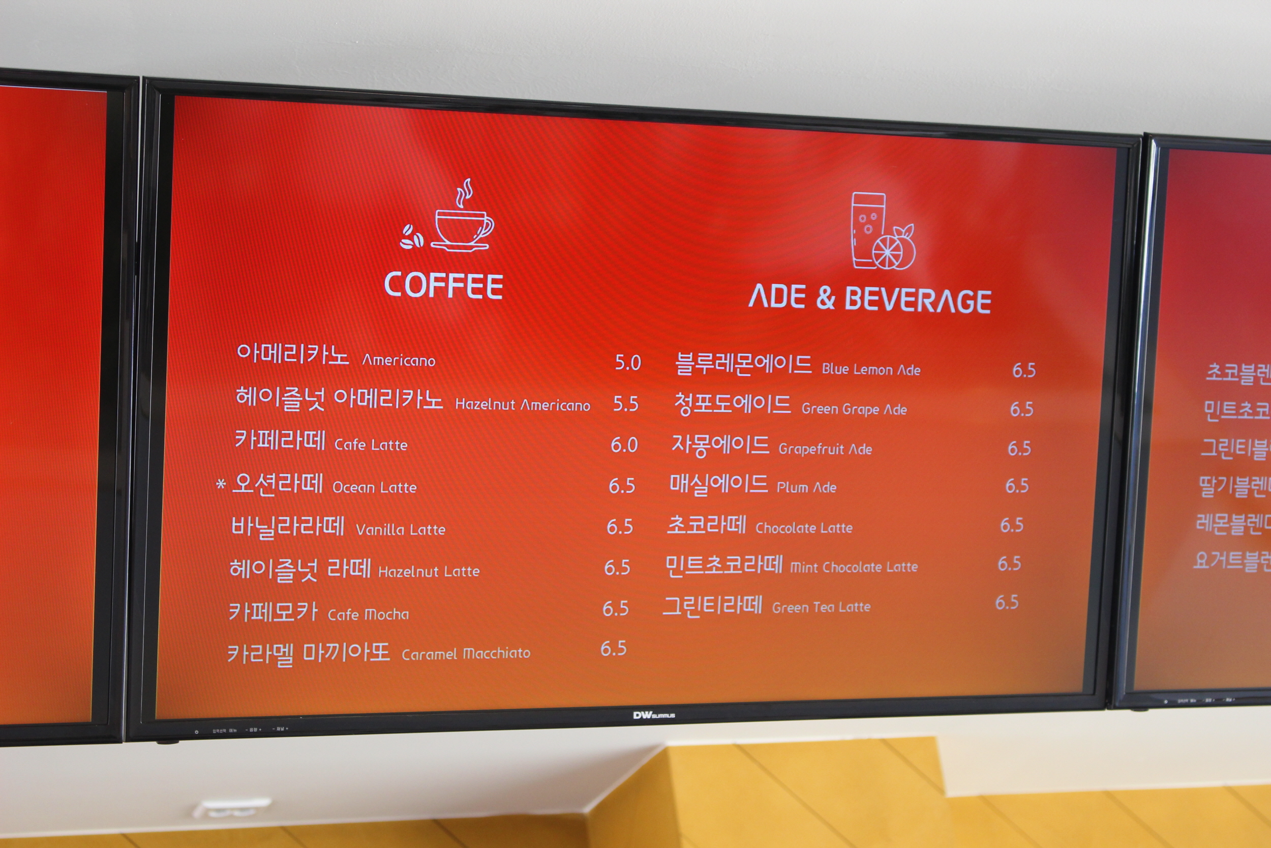 아메리카노 5.5 / 헤이즐넛 아메리카노 6.0 / 카페라떼 6.5 / 오션라떼 8.0 / 바닐라라떼 7.0 / 헤이즐넛 라떼 7.0 / 카페모카 7.0 / 카라멜 마끼아또 7.0