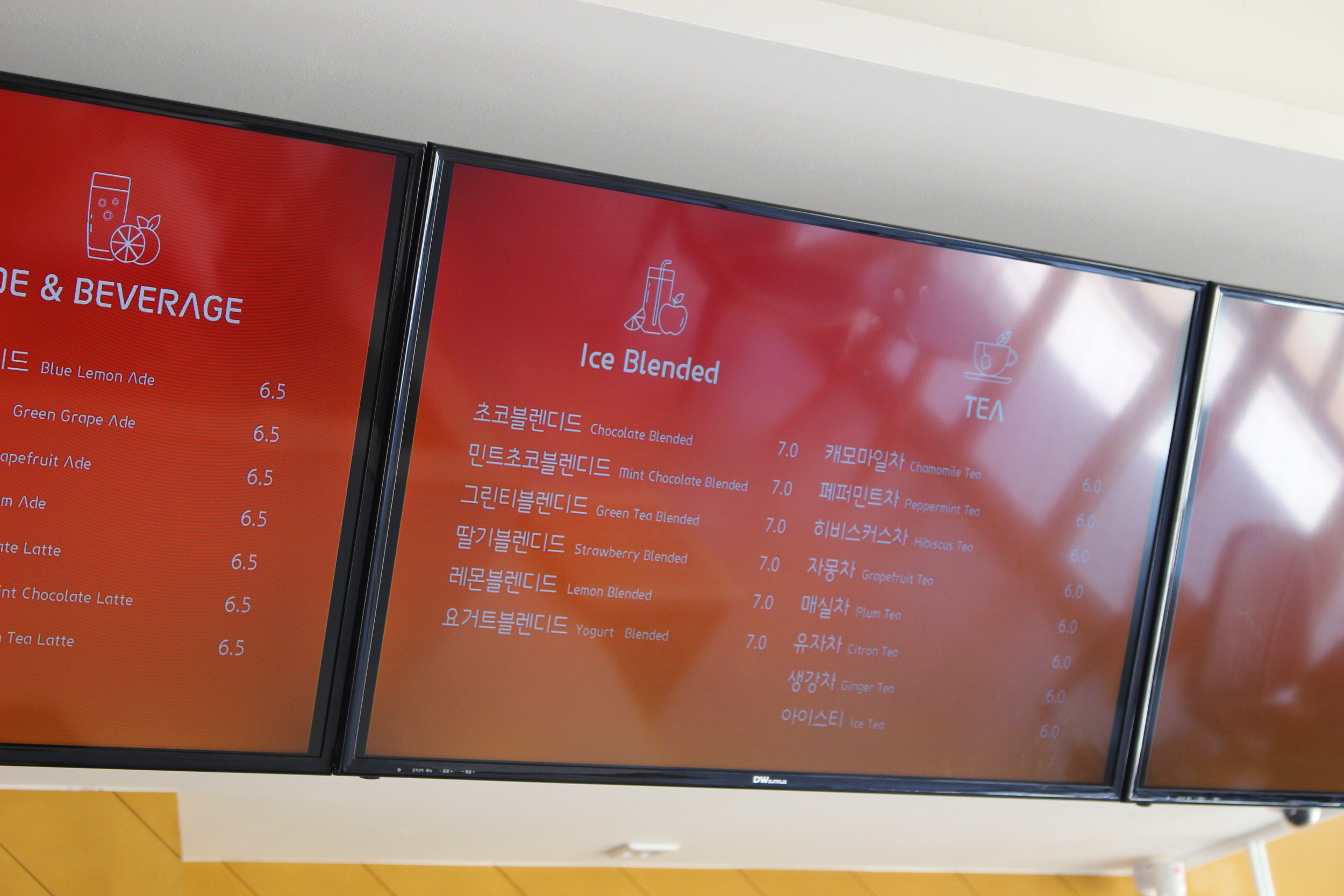 블루레몬에이드 7.5 / 청포도에이드 7.5 / 자몽에이드 6.5 / 초코라떼 7.5 / 그린티라떼 7.5