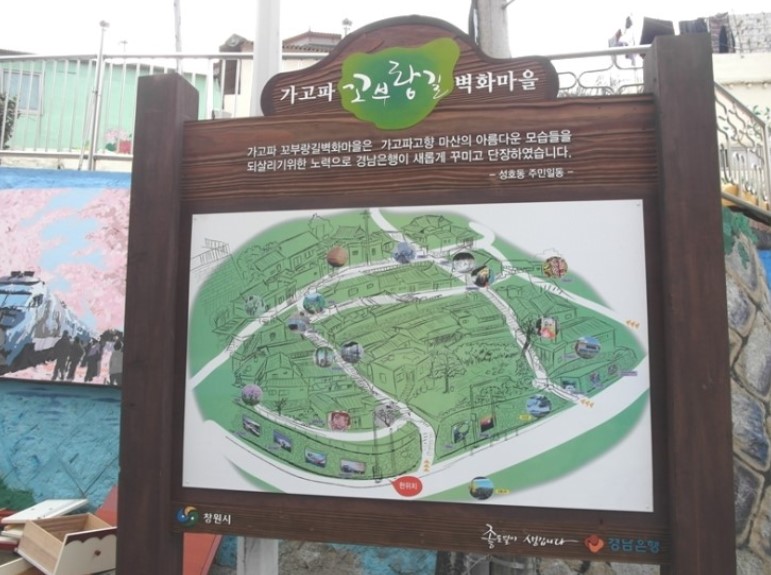 가고파 꼬부랑길 벽화마을은 가고파고향 마산의 아름다운 모습들을 되살리기 위한 노력으로 경남은행이 새롭게 꾸미고 단장했다고 설명되어 있었습니다. 문신미술관이랑 가까운 곳에 있으니 문신미술관에 안 가보신 분 들은 두 곳 다 구경하시면 좋을 것 같습니다.