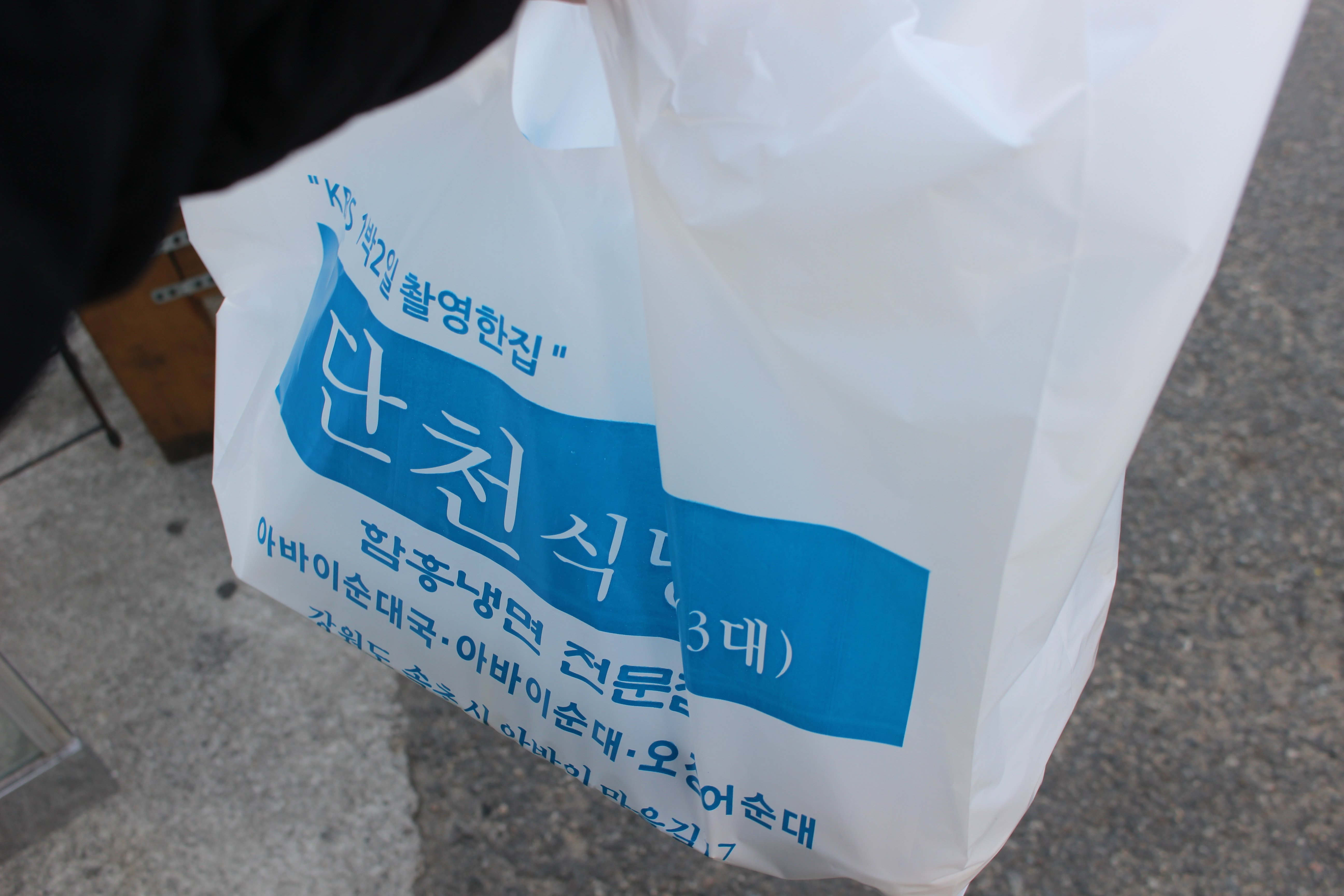 아까 아바이마을 단천식당에서 사 온 모듬순대 포장을 풀러 봤습니다.