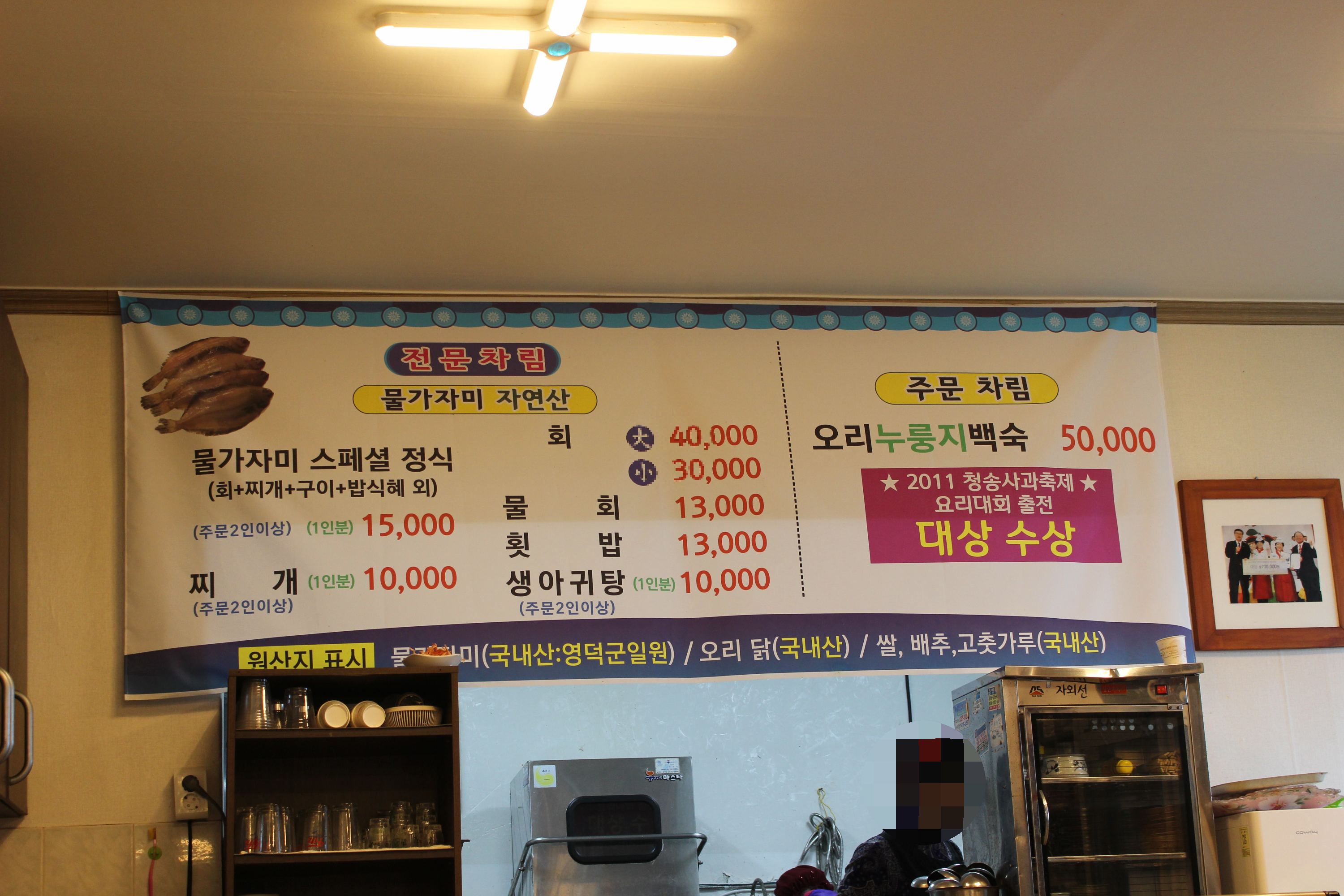 그 밖에 회 대 사이즈 4,000원, 소 사이즈 30,000원도 있습니다. 물회는 13,000원, 횟밥은 13,000원, 생아귀탕은 10,000원입니다. 주문 차리으로 오리 누룽지 백숙 50,000원도 있습니다. 2011 청송사과축제 요리대회 출전 대상 수상이라고 하니 그 맛이 궁금해집니다.