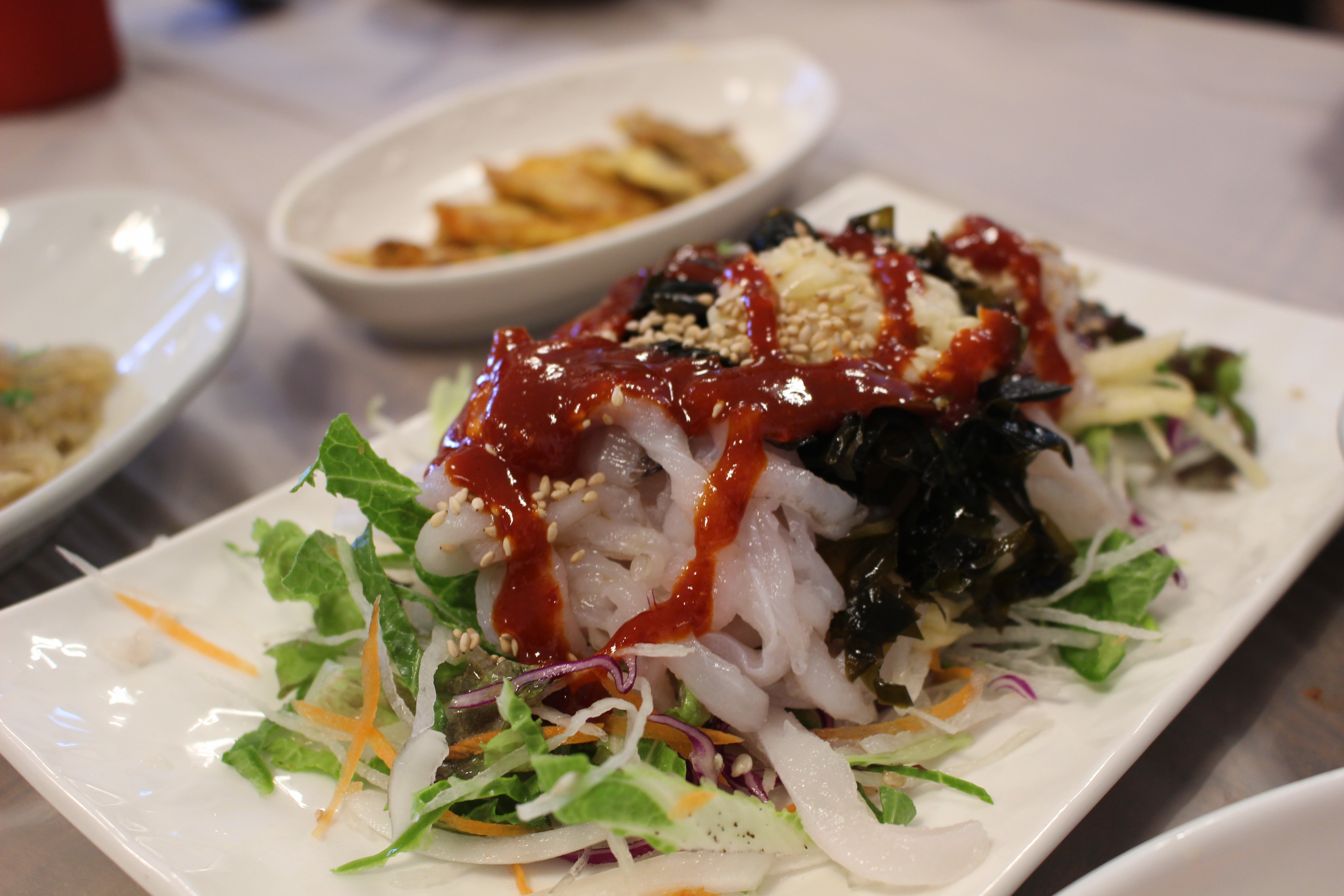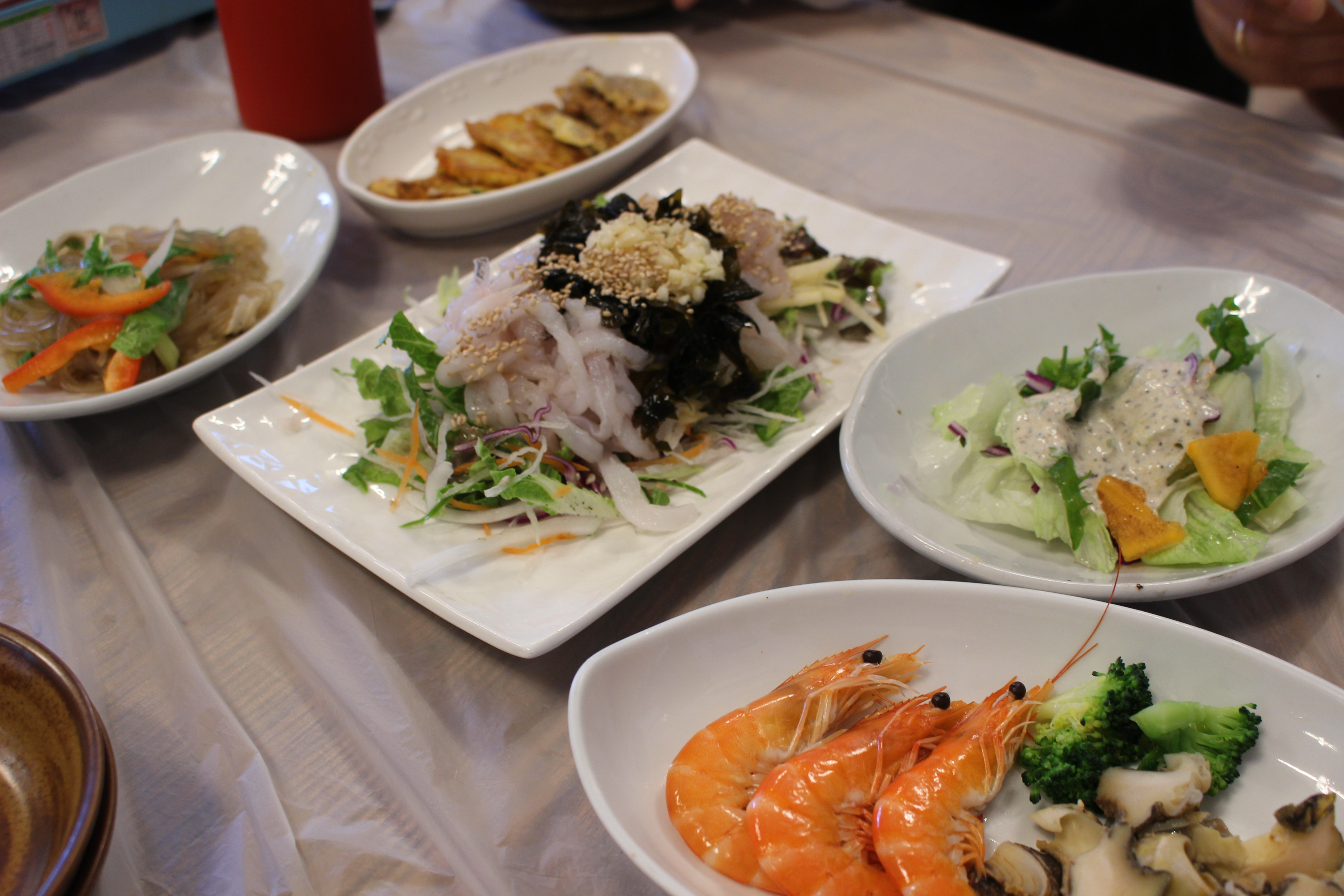 잡채, 전, 회무침, 샐러드, 새우, 소라와 브로콜리도 함께 나왔습니다. 아이들이 함께 먹을 수 있는 음식도 있어서 아이와 오기에도 좋은 식당입니다.