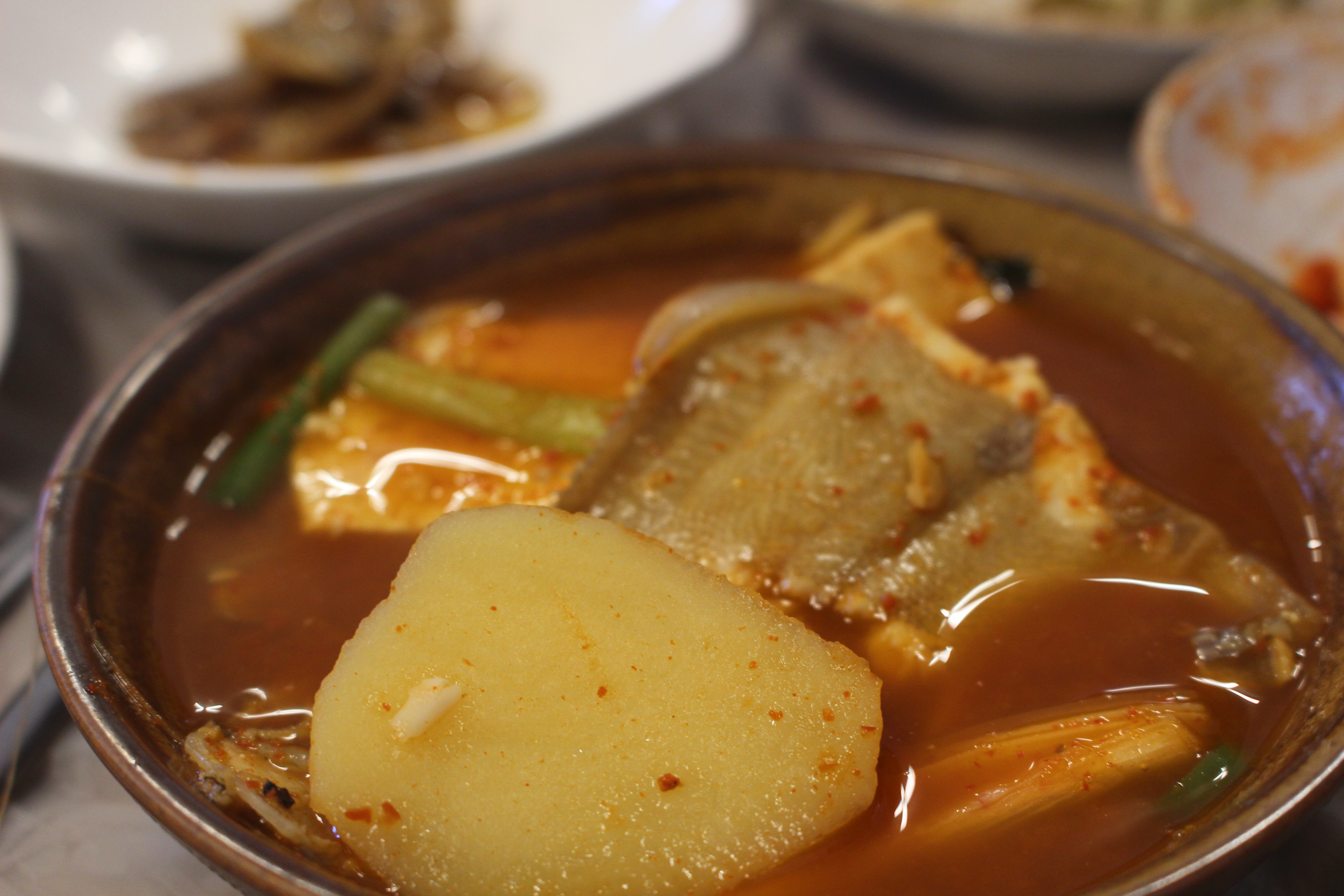 찌개를 앞접시에 덜어 맛봤습니다. 생선과 함께 감자, 두부가 있어 더 포만감 있게 먹을 수 있었습니다.