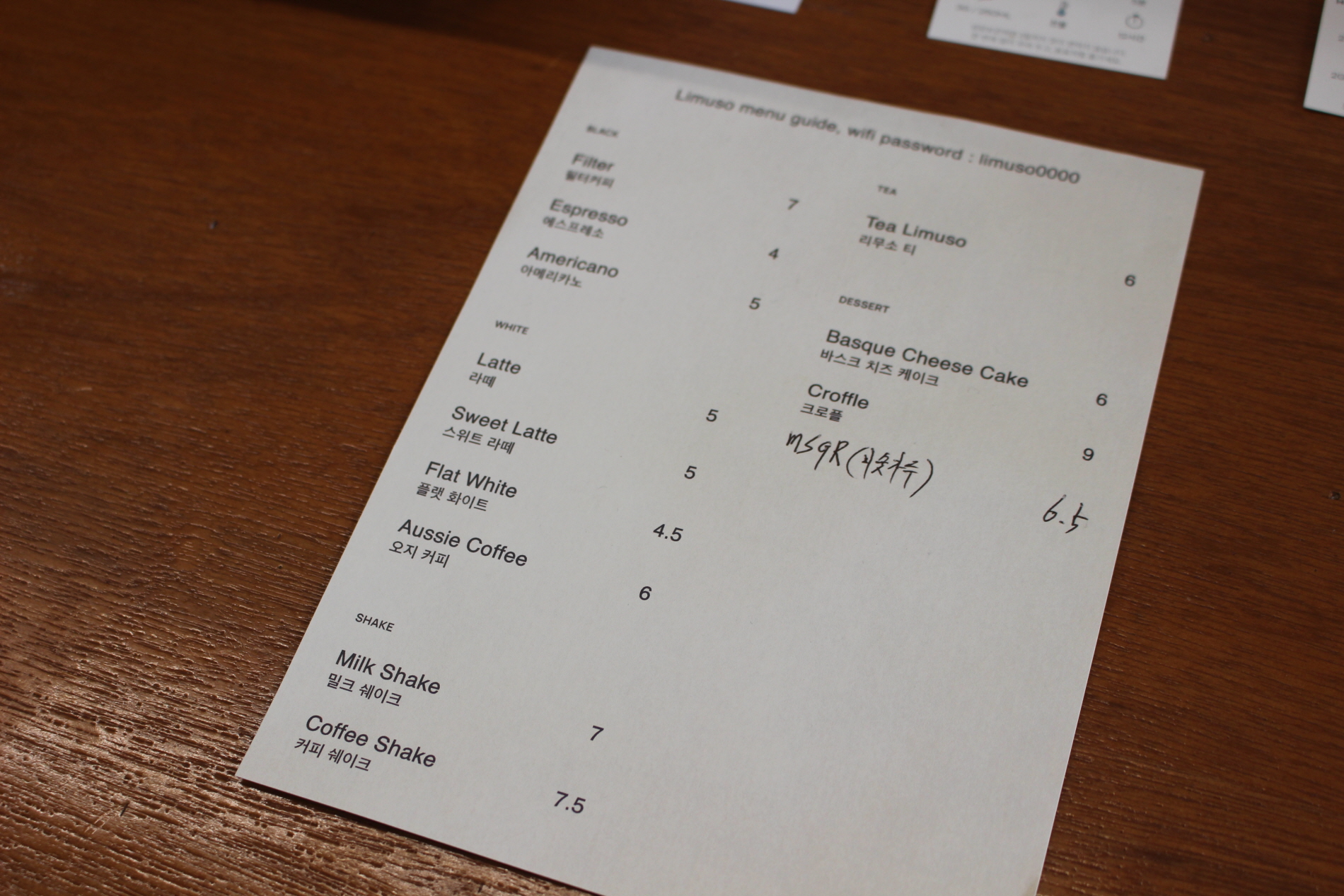 천안여행 카페 리무소커피의 메뉴와 가격입니다.