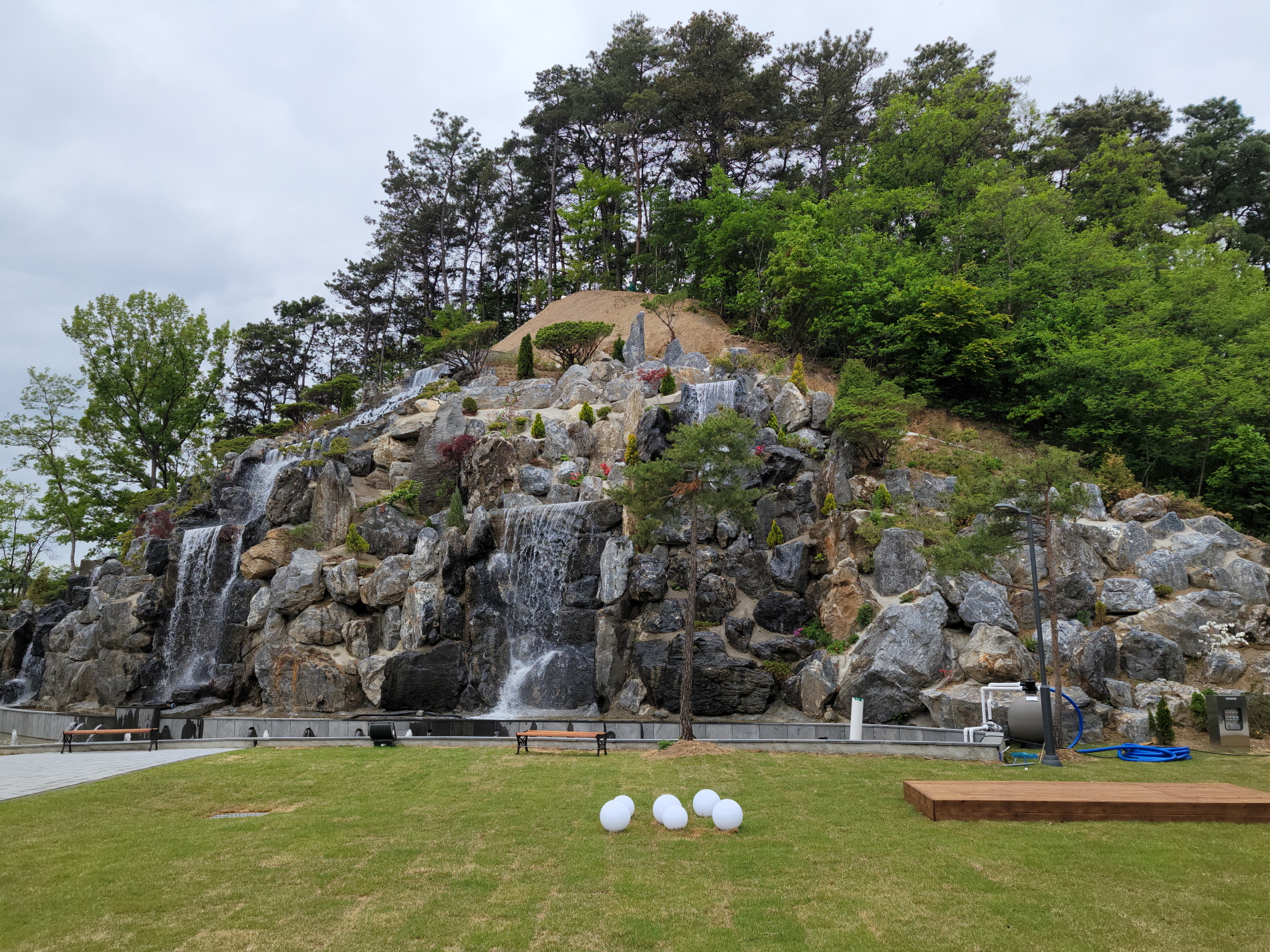 바로 앞에 공용으로 사용하는 잔디밭과 폭포가 있습니다.