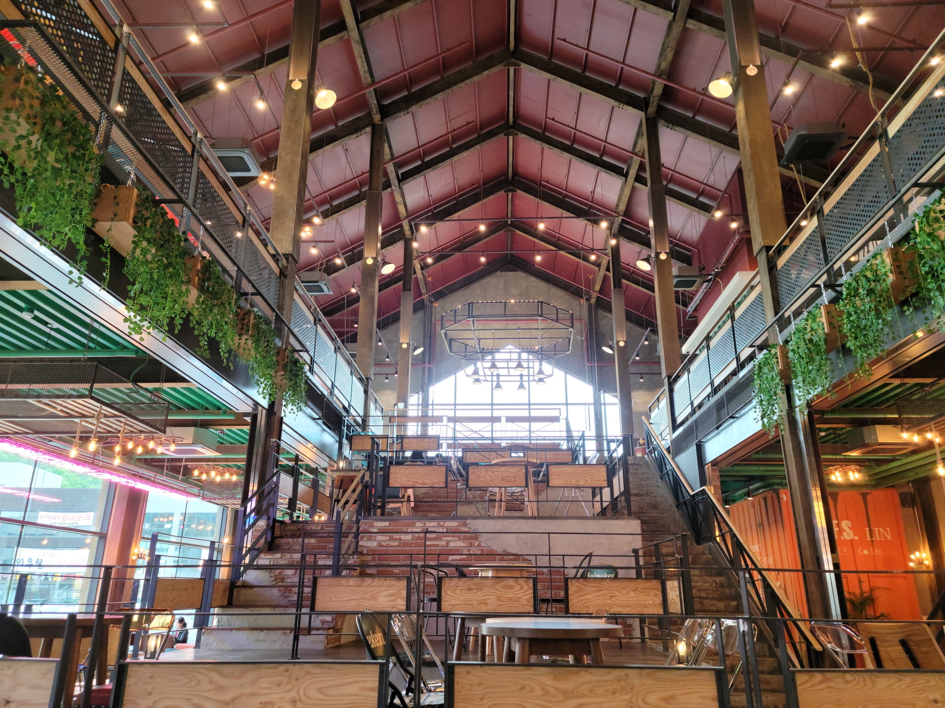 2층으로 올라가는 계단 중간중간 자리가 있고 2층으로 올라가면 또 양쪽으로 테이블이 마련되어 있습니다.
