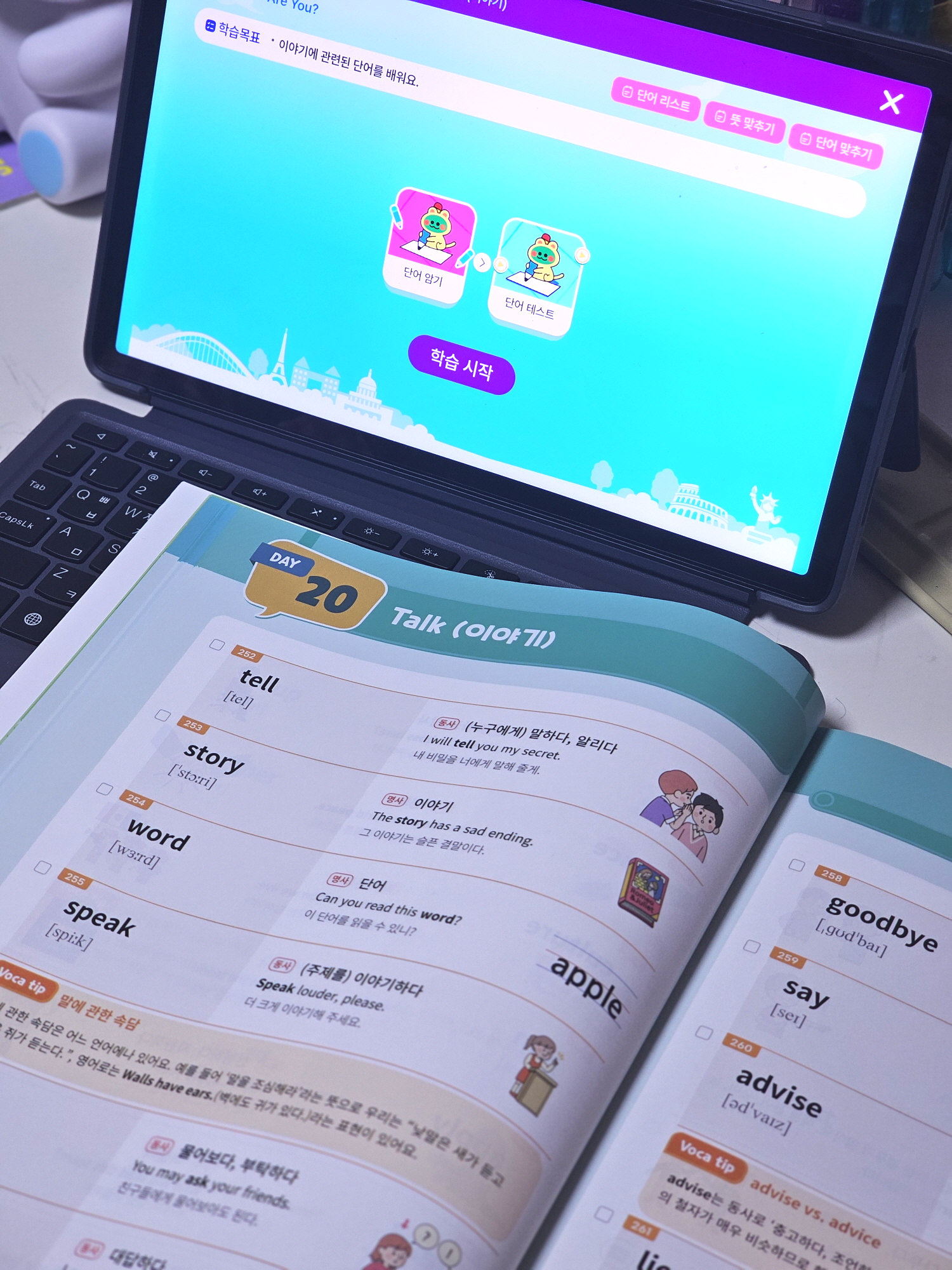 이날은 초급 초등 영단어 800 기본 Day 20.Talk (이야기) 단어 스케줄링이 되어 있어 공부하는 모습을 한번 찍어봤어요.