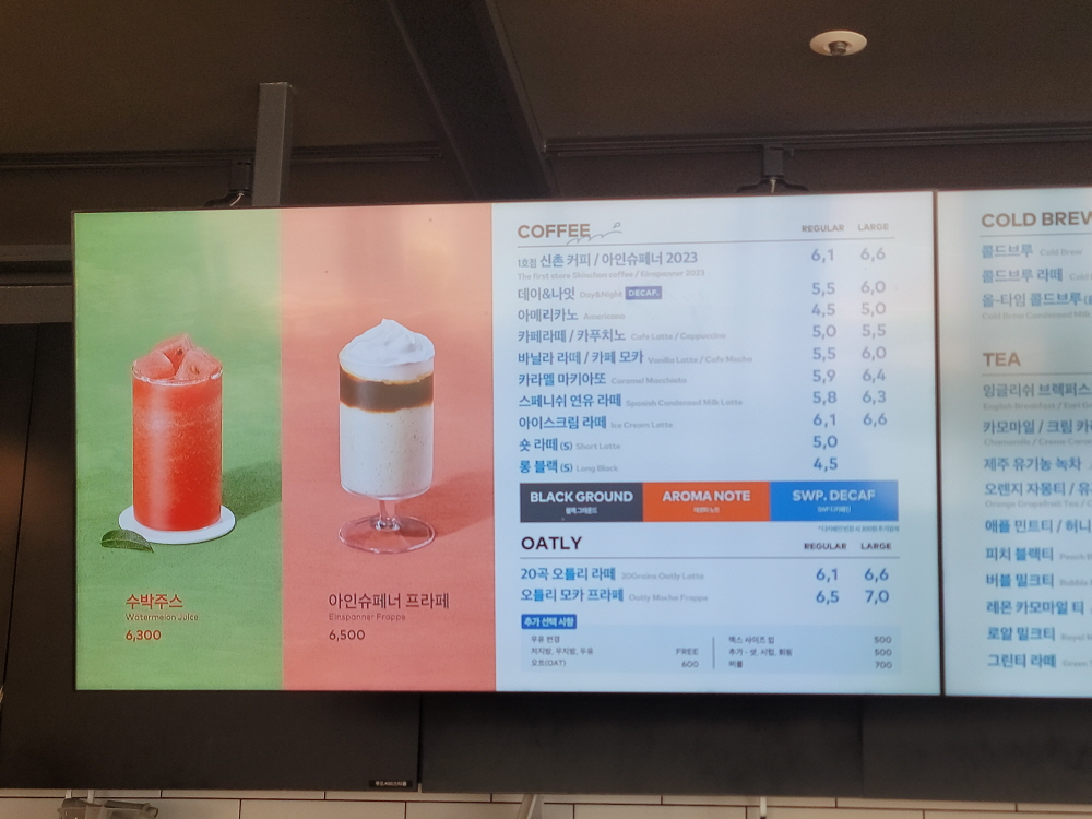 그 밖에 1호점 신촌커피, 아인슈페너 2023, 데이&나잇, 카페라떼, 카푸치노 등 다양하게 준비되어 있어요.