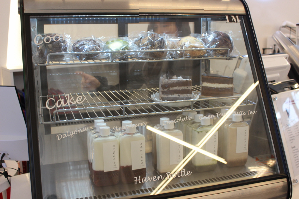 작은 쇼케이스에서 쿠키, 케이크, 보틀 음료도 눈으로 확인할 수 있습니다.