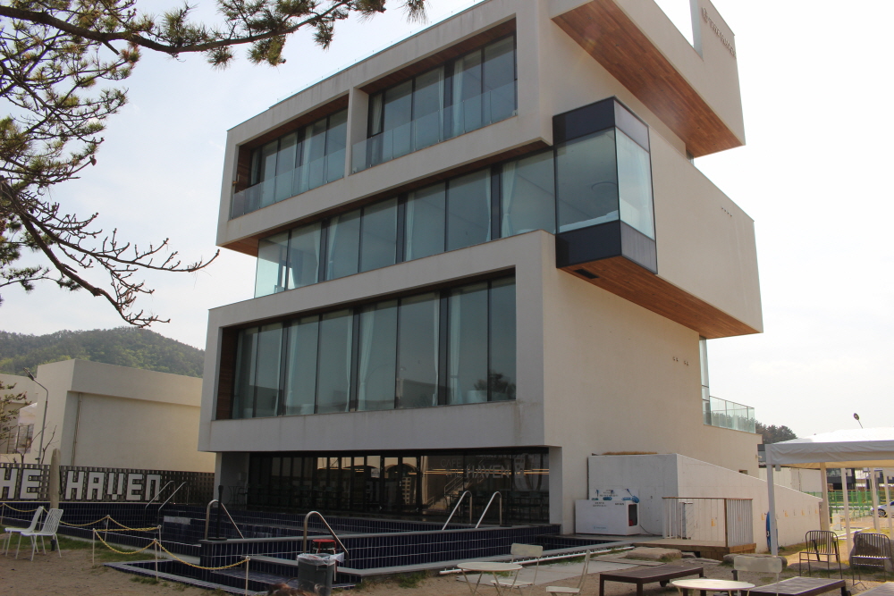 해변가에서 바라본 더헤이븐 카페 건물 모습입니다.
